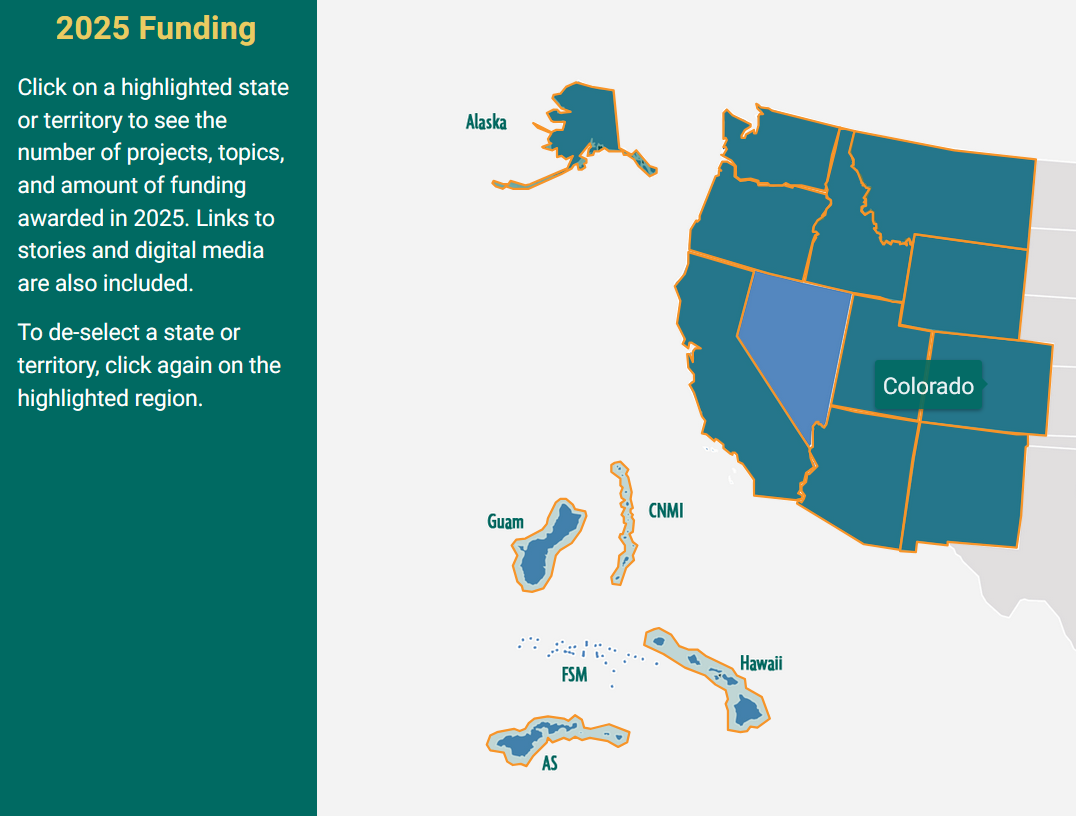 Learn more about our 2025 funded projects and impacts from previously funded projects. On this interactive infographic, click on a highlighted state or territory to see the number of projects, topics, and amount of funding awarded in 2025. Links to stories and digital media are also included.
