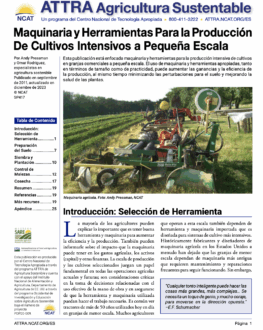 This is the Spanish translation for the "Equipment and Tools for Small-Scale Intensive Crop Production" publication. This publication focuses on equipment and tools for intensive crop production on a small-scale commercial farm. It details equipment and hand tools for soil preparation, planting, weed management, and harvesting. The use of appropriate equipment and tools, both in terms of size and practicality, can increase production efficiency and profits while minimizing disturbance to soil and to plant health. Lists of further resources and tool and equipment suppliers are included.